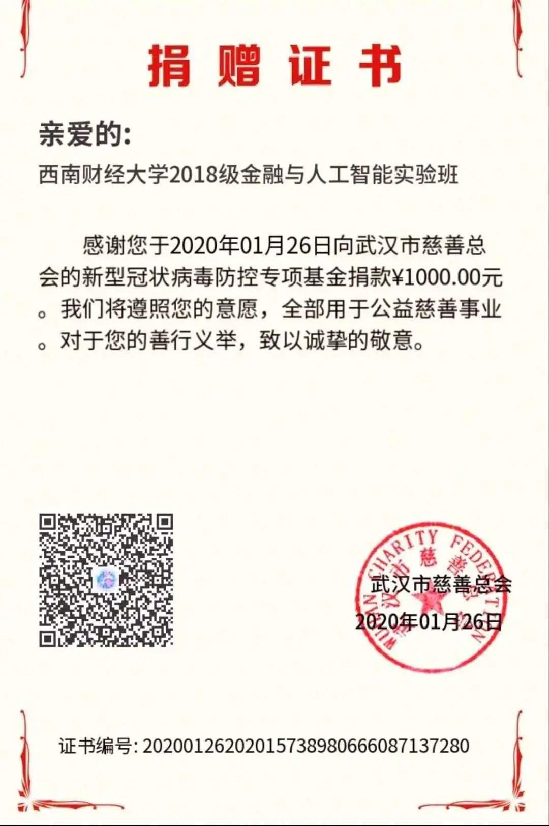俗话说“天下兴亡,匹夫有责。”每天看着新闻上有关疫情的消息,同学们心中五味杂陈,总想着做些什么事,但又不能奔赴一线,不免有些遗憾。后来,经常在电视上看到有关捐款捐物的消息,作为2018级金融与人工智能实验班的班长,我便向班委们提出捐款的意见,班委们一致觉得这是个不错的方法。我们在班群向同学们说明了初衷和想法后,大家都非常支持。最后,动用了500元班费和额外捐款500元,2018级金融与人工智能实验班总共向武汉捐款1000元。