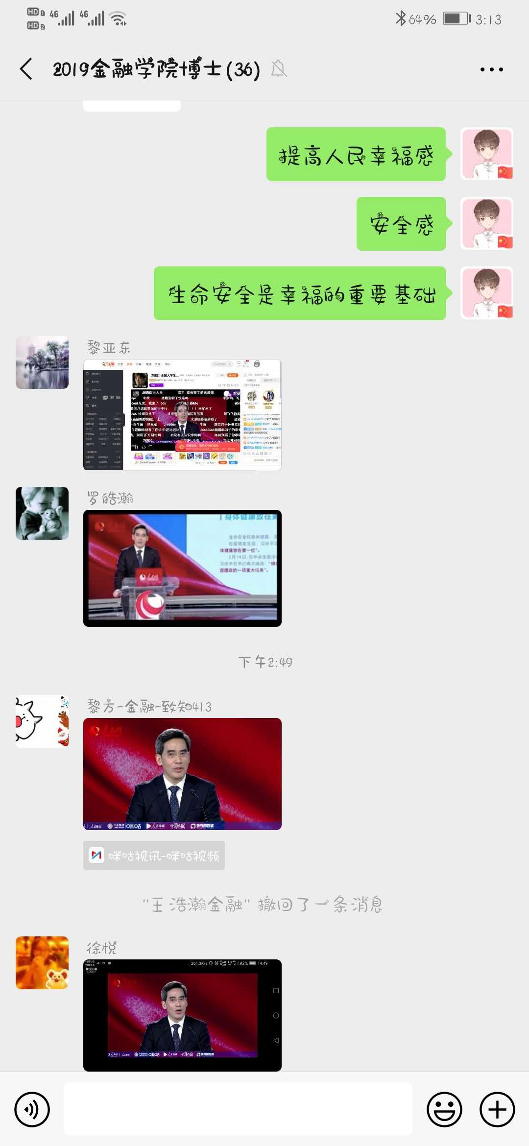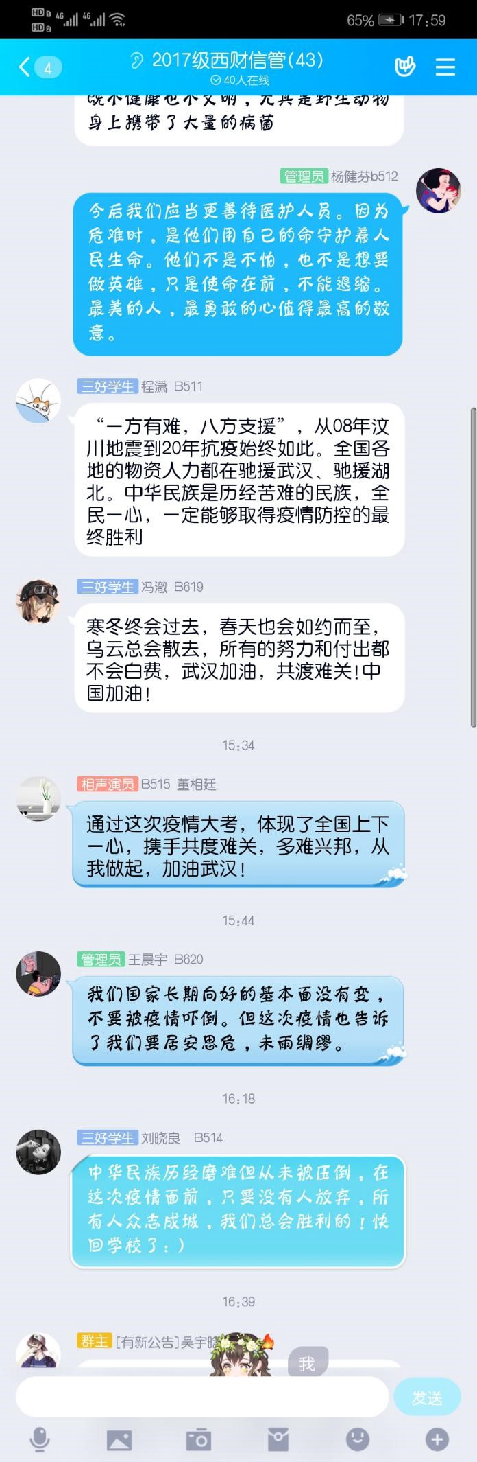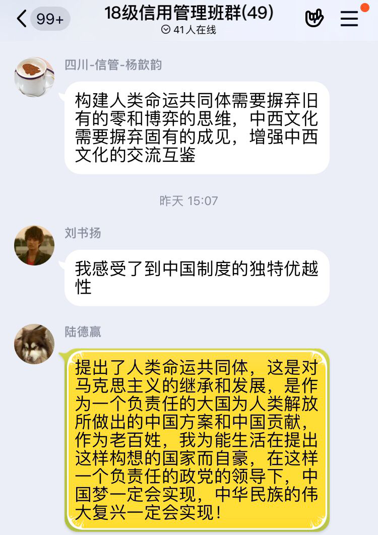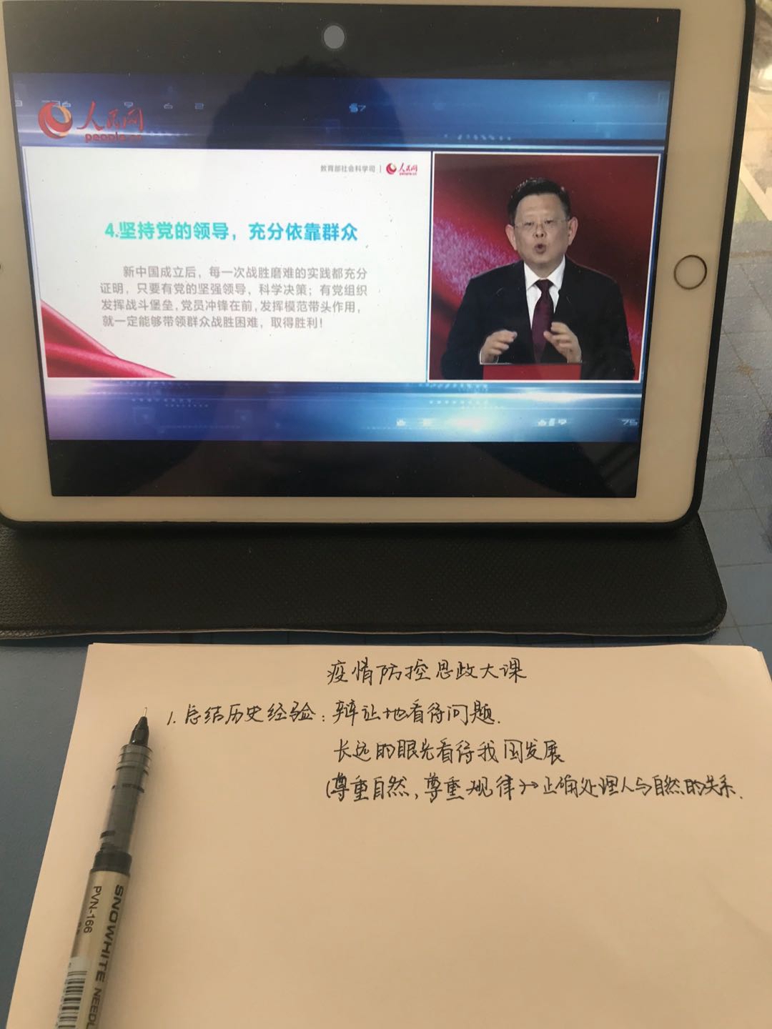 大家表示,通过学习研讨,更深刻理解了以习近平同志为核心的党中央疫情防控的战略决策部署、举国抗疫彰显的中国共产党领导和中国特色社会主义制度的显著优势,防疫战疫一线感人故事更是催人奋进。大家表示将坚决维护党的领导,增强“四个意识”,坚定“四个自信”,做到“两个维护”,传承和弘扬爱国主义精神,学好知识,练好本领,为民族复兴贡献自己的青春和力量!