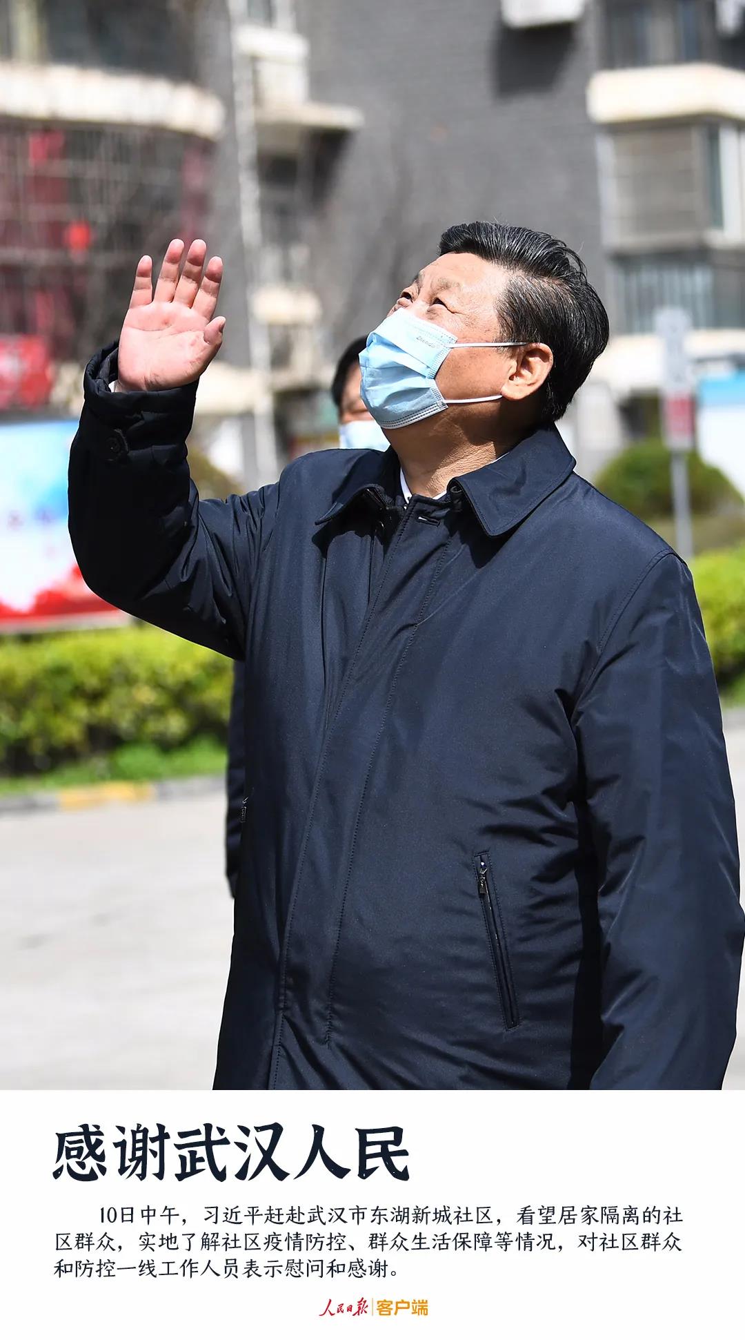 习近平强调,在这场严峻斗争中,武汉人民识大体、顾大局,不畏艰险、顽强不屈,自觉服从疫情防控大局需要,主动投身疫情防控斗争,作出了重大贡献,让全国全世界看到了武汉人民的坚韧不拔、高风亮节。正是因为有了武汉人民的牺牲和奉献,有了武汉人民的坚持和努力,才有了今天疫情防控的积极向好态势。武汉人民用自己的实际行动,展现了中国力量、中国精神,彰显了中华民族同舟共济、守望相助的家国情怀。武汉不愧为英雄的城市,武汉人民不愧为英雄的人民,必将通过打赢这次抗击新冠肺炎疫情斗争再次被载入史册!全党全国各族人民都为你们而感动、而赞叹!党和人民感谢武汉人民!