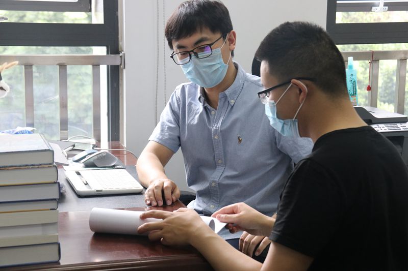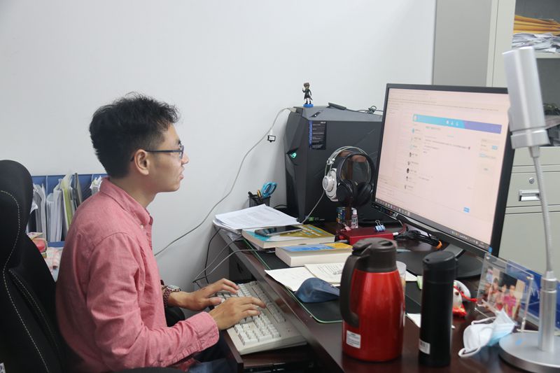 在陈勇老师的办公室,他正在线上跟自己的研究生交流论文修改方案,他的学生未能返校,他每天要花大量时间在线上进行指导,他希望学生们能顺利通过论文答辩。
