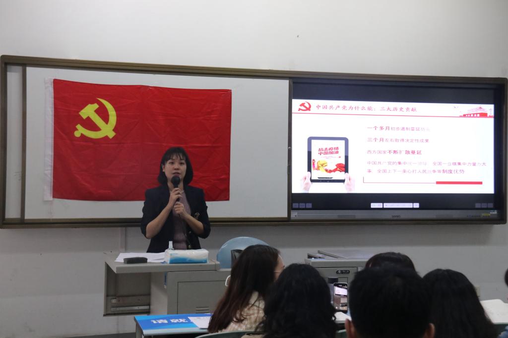 专题党课上,李书记带领党员发展对象重温了中国共产党的建党史、新中国史、改革开放史、社会主义发展史,结合救国、兴国、富国、强国的四个历史时期,回顾了中国共产党带领中国人民实现站起来、富起来到强起来的伟大历史飞跃。他强调党史是国史的一大重要部分,在迎接中国共产党建党一百周年之际,希望各位党员发展对象要认真学习“四史”,坚定“四个自信”,做到不忘历史、不忘初心,知史爱党、知史爱国,努力实现“两个一百年”奋斗目标。10月13日下午,谭敏副书记围绕“明确初心使命,端正入党动机”主题,向同学们讲述了中国共产党为什么能做出伟大的历史贡献、如何发挥党员的先锋模范作用以及端正入党动机三项重要内容。谭书记强调,作为一名党员,意味着要挑更多的重担、要做更多的牺牲;全心全意为人民服务,冲锋在前,随时准备为党牺牲一切,永不叛党,是千千万万个共产党员一生诠释的誓言。