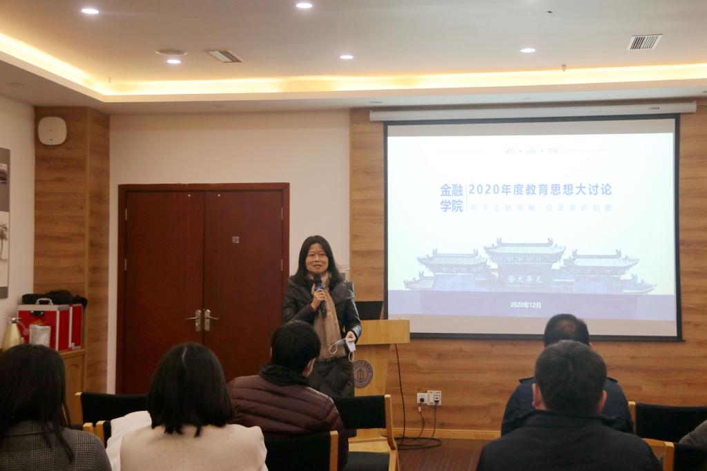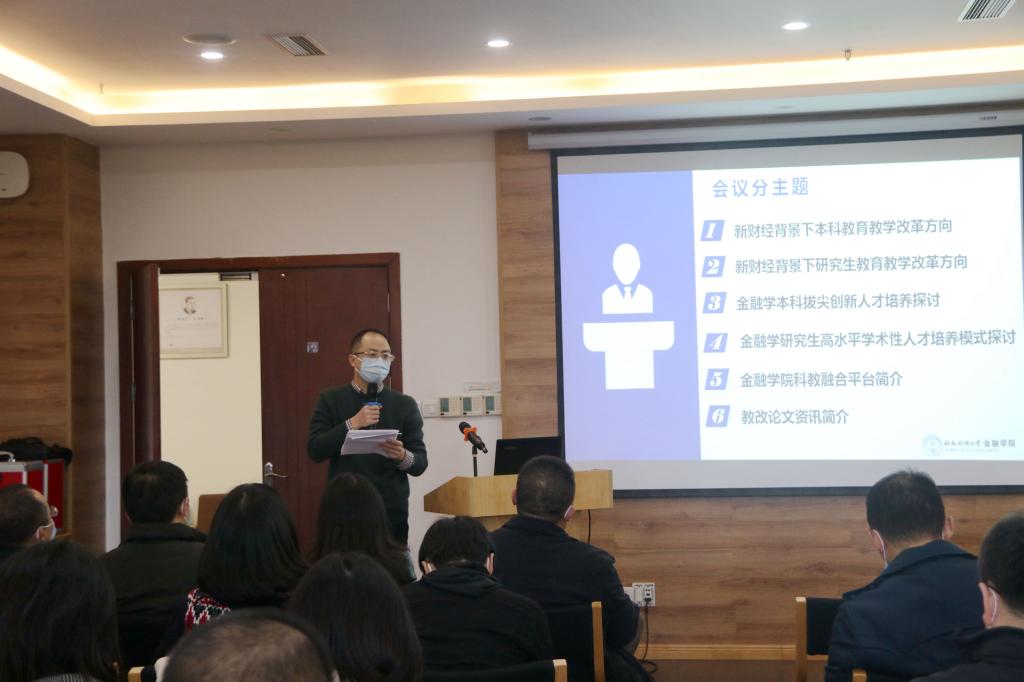 在学院主题发言阶段,金融学系主任翁舟杰从以金融学一流专业建设统领一流课程、一流教材建设的具体做法与大家分享了在培养本科拔尖创新人才中教师所起到的重要作用,鼓励大家加大教学投入,重视教学成果的积累;金融工程系主任朱波以金融工程研究生培养的机遇、现状提出紧随国家重大战略和行业发展前沿改革研究生培养模式,切实提升研究生的学术能力;科研秘书陈奕老师向大家介绍了学院“金融科技实验平台-海外导师指导平台-论文线上交流平台-教师高水平交流交换平台-中国金融数据平台”五位一体的科教融合平台以及借助该平台资源建设的学术之星学生社团的建设成效;教学秘书宋珂慧老师向大家介绍了学院近年来教改论文的发表情况和发表资讯,希望老师们能重视科教融合,推动科研成果与教研成果的相互转化与融合。