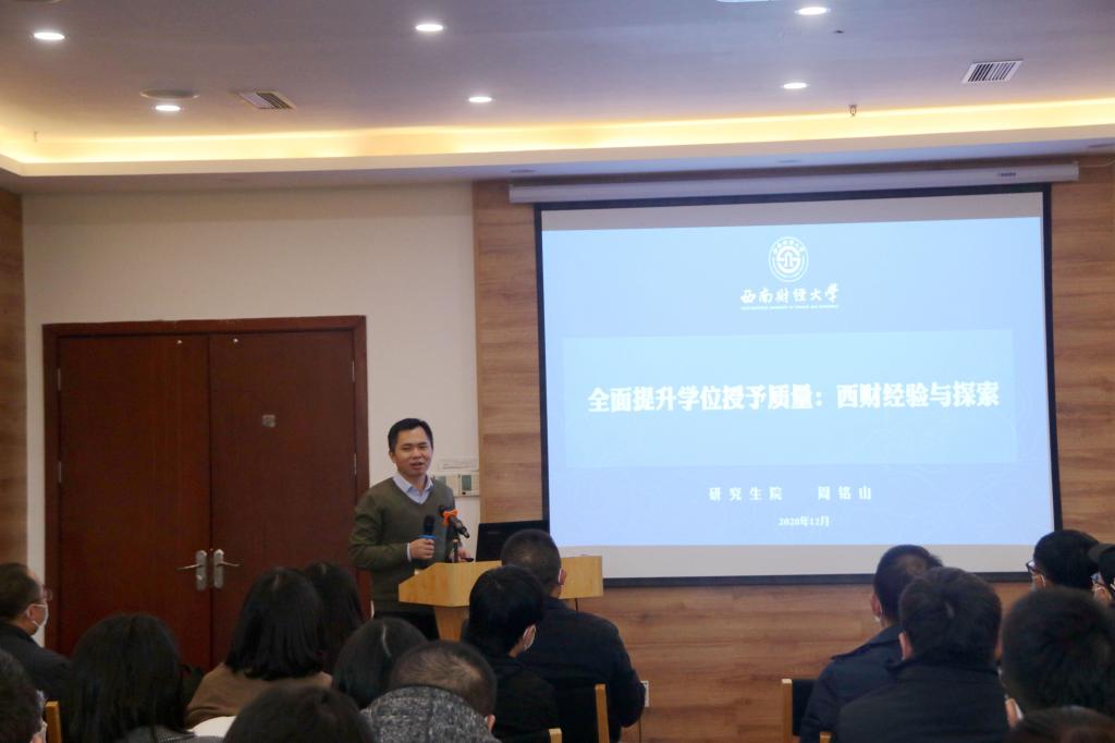 研究生院院长周铭山以“全面提升学位授予质量:西财经验与探索”为主题首先介绍了全国研究生教育大会精神和对研究生培养提出的新要求,着重介绍了学校全面提升学位授予质量的经验与探索,重点在于抓学生,苦练科研内功;抓导师,夯实履职能力;抓管理,前置质控关口,最后提出在“破五唯”的背景下保证授位质量的工作思路。