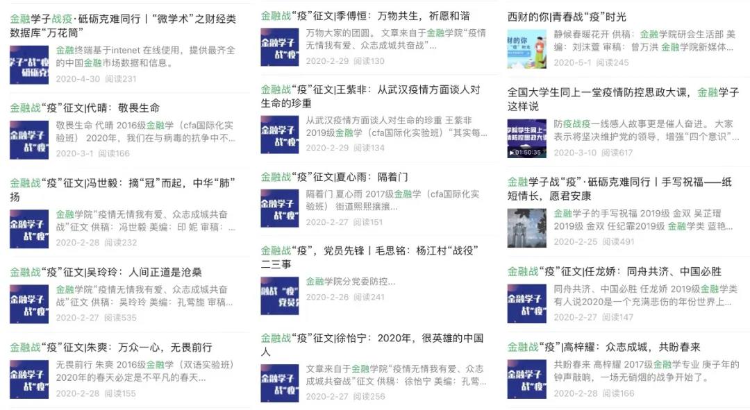 14m永利官网将思政教育创新与新媒体相结合,引导学生密切关注国家社会时事热点,培养学生家国情怀。疫情期间,学院官方微信公众号总计发布疫情相关推送百余篇,其中包括学院抗疫主题活动推文40余篇,院级及以上抗疫工作总结及部署文案推送10余篇,发布“14m永利官网分党委倡议书”“我是西财金融人,我承诺”等倡议推文,汇聚学院师生正能量,抗击疫情共克时艰;开设“金融战‘疫’,党员先锋”专栏,报道党员师生在疫情防控期间主动服务社会的故事;组建疫情应急研究小组,及时推出“西财·观点”系列疫情应急对策研究文章;推出“不忘初心、牢记使命”系列推送、建党100周年系列推送、“红色金融耀百年”党史学习教育系列微课程等特色栏目,立体化展示“标杆院系”建设情况,全方位展示拼搏向上的时代力量。