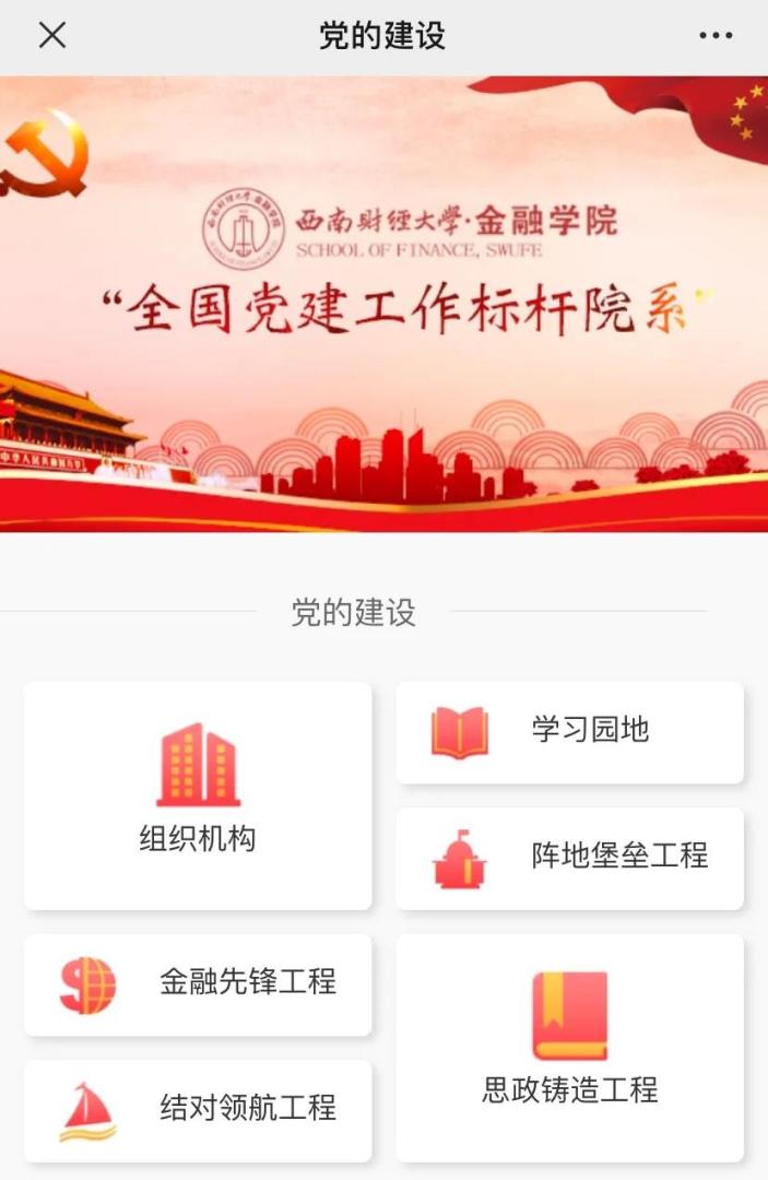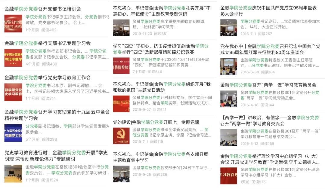 14m永利官网切实贯彻落实学校党委工作部署,构建以微信、微博、微信群为架构的媒体矩阵,旨在以点带面发挥媒体宣传功能,推动学院党建质量全面提升创优;通过搭建学院、教师、学生三位一体的沟通平台,设置“标杆院系”党建校园微站,下设“组织机构”“学习园地”“阵地堡垒工程”“金融先锋工程”“思政铸造工程”“结对领航工程”“党代会精神”“党史学习教育”八大数字化板块,学院师生“随时了解、随地学习”的党建新模式。共发布140余篇文章,内容涉及党代会精神、学院专题学习、党建活动、党员先进事迹等,及时准确发布相关政治思想,开展“专题党课”报道,发布学院党委书记、学院院长思政专题课相关推文,开展“不忘初心”专栏推送,报道学院“金融先锋·学兵计划”“我和我的祖国主题党日”等活动,实现党建活动宣传全覆盖,不断深化党建和思想政治工作。