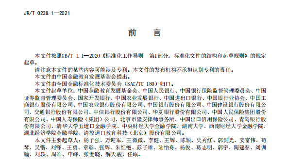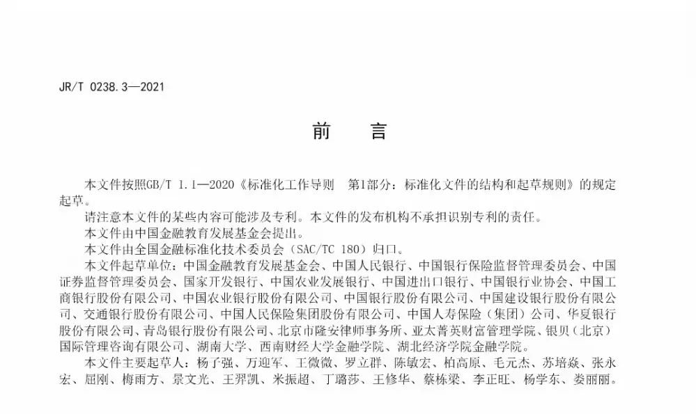 2021年12月29日,中国人民银行正式发布《金融从业规范》系列金融行业标准,包括《金融从业规范风险管理》(JR/T 0238.1—2021)、《金融从业规范外汇交易》(JR/T 0238.2—2021)和《金融从业规范财富管理》(JR/T 0238.3—2021)三项金融行业标准,分别规定了金融从业人员在风险管理、外汇交易和财富管理方面的职业要求,包括知识体系、职业能力、职业道德与行为准则、职业能力水平评价等。三项国家标准由全国金融标准化技术委员会归口管理,由中国金融教育发展基金会提出并组织起草,行业内有关单位共同参与。标准经过广泛征求意见和论证,并通过了全国金融标准化技术委员会审查。