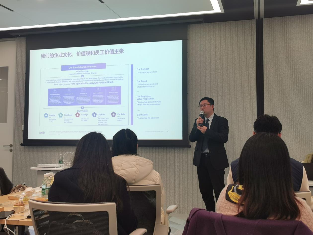 公司HR李思彤介绍了应届毕业生招聘流程和实习项目,并给同学们进行了网申和面试的技巧培训。活动中,师生代表参观了公司的工作场所,充分感受毕马威的办公环境、工作氛围。