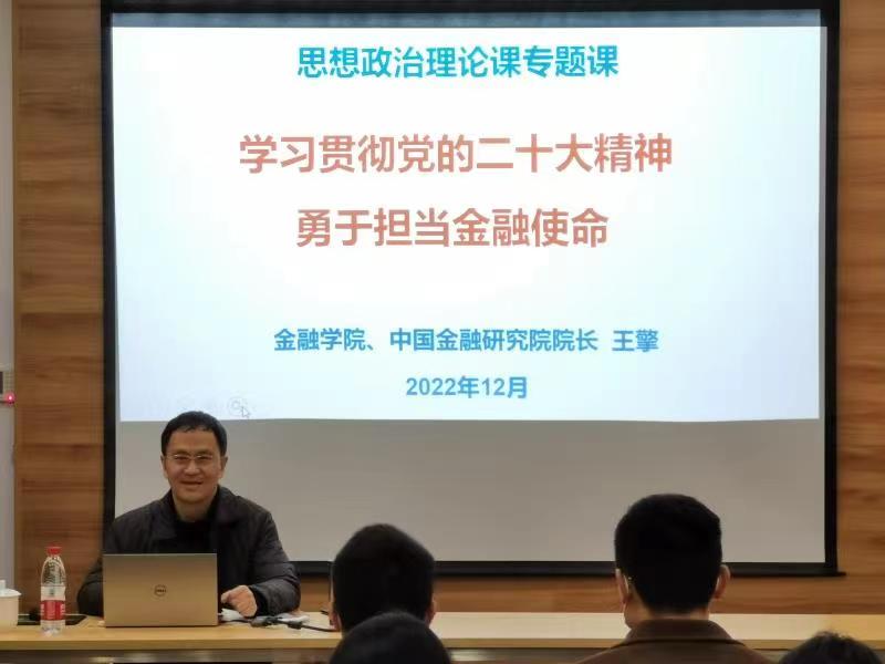 为深入学习贯彻党的二十大精神,12月5日下午,14m永利官网、中国金融研究院院长王擎在格致楼411会议室以“学习贯彻党的二十大精神,勇于担当金融使命”为主题,讲授思想政治理论专题课,学院(研究院)各年级学生代表参加学习。