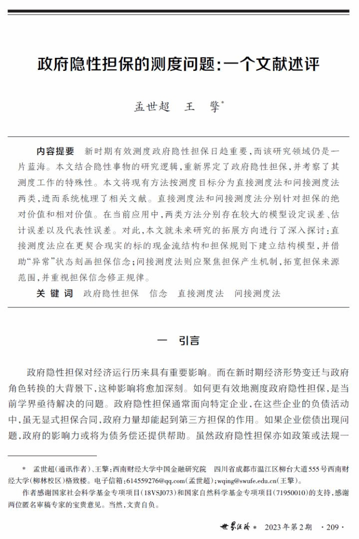 近日,由我院孟世超博士(第一作者)与王擎教授合作的论文《政府隐性担保的测度问题:一个文献述评》在2023年第2期《世界经济》杂志上发表。