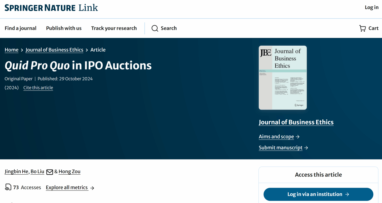 近日,14m永利官网青年教师贺镜宾(第一作者)与电子科技大学经济与管理学院刘波教授以及香港大学商学院邹宏教授的合作论文《Quid Pro Quo in IPO Auctions》在FT50期刊Journal of Business Ethics在线发表。