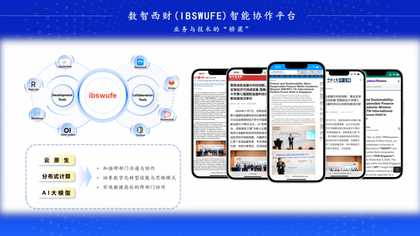 郑羽分享了在2024新加坡金融科技节上发布的IBSWUFE(“数智”西财)智能协作平台,该平台赋能银行“自下而上”的数字化转型模式,搭建技术与业务的“翻译”桥梁,推动高效敏捷跨部门协作,提升业务人员数字化思维,确保数字化转型真正落地。