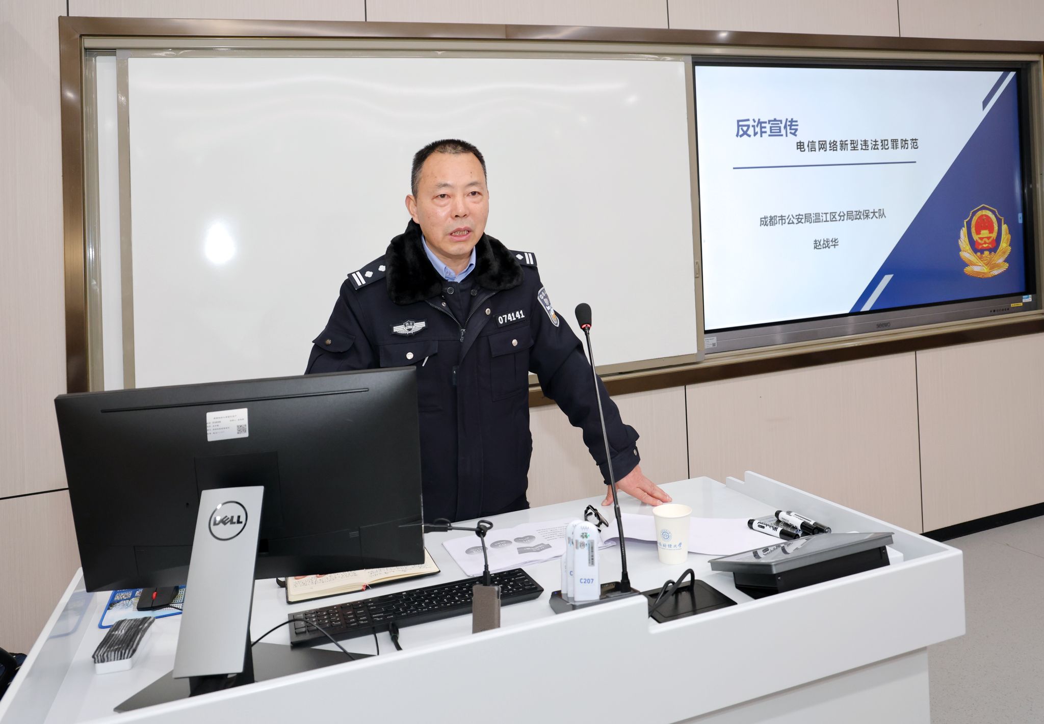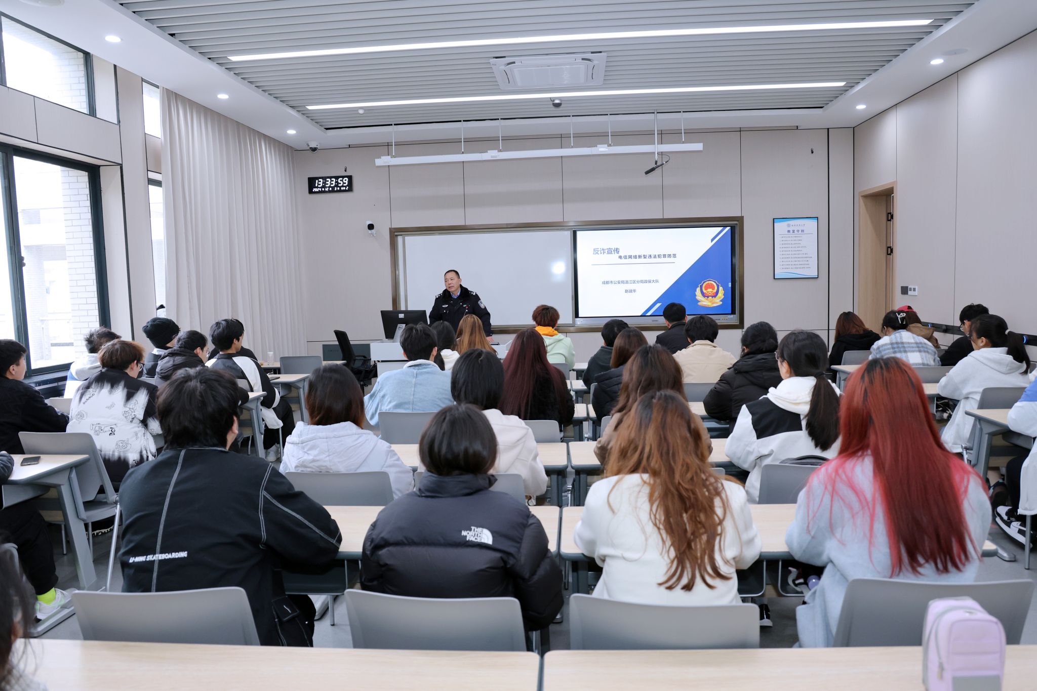 胡航宇老师就当前国家安全面临的复杂形势以及个人在维护国家安全中的责任与义务等方面进行了全面而深入的剖析,鼓励大家增强国家安全意识,共同维护国家的安全和稳定。赵战华警官重点围绕防诈骗信息展开讲解,结合实际案例,深入浅出地介绍了当前各类诈骗手段的特点及防范方法,如网络诈骗、电话诈骗、校园贷等诈骗陷阱。特别强调了大学生群体易受骗的原因,如社会经验不足、防范意识薄弱等,并针对性地给出了防范建议,提醒师生们要时刻保持警惕,不轻易透露个人信息,遇到可疑情况及时与警方或学校相关部门联系。