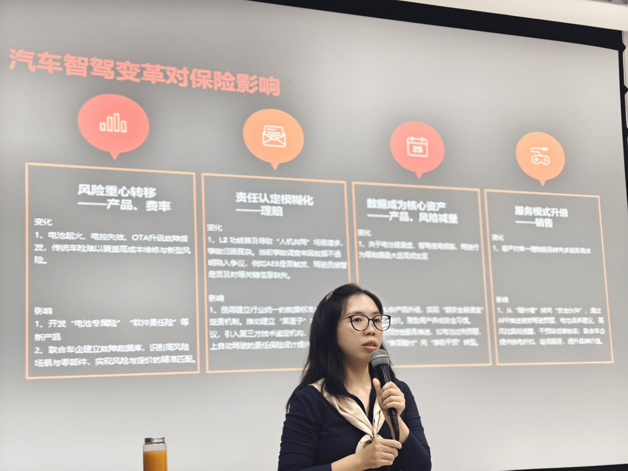 2025年9月30日,在永利14m在线登录官网光华校区,一场关于风险管理前沿的深度对话在保险专业研究生的课堂上展开。平安产险四川分公司车险部精算经理张梦欣,以“汽车智驾与数字科技改革对保险行业的影响”为核心主题,系统解码智驾浪潮与数字革命下车险行业的转型方向与实践路径,带来一场兼具专业深度、实践价值与前瞻视野的思想分享。这是《风险减量与保险创新》产教融合课程的第四次授课。