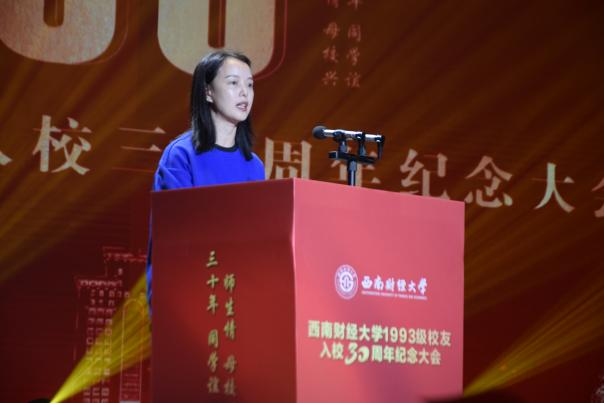 14m永利官网、中国金融研究院校友潘蔚女士代表93级校友发言。通过回望母校近百年的发展历程,她感慨学校在学科发展建设中取得的重大成果,以及推进新财经战略升级的决策部署。回顾在母校的青春岁月和独特记忆,潘蔚校友代表同学们表达了对母校、领导和老师的敬意与感恩。最后,她谈到作为西财学子,应牢记校训,不忘初心,用在母校习得的知识在各自的领域为社会的发展做出贡献,发扬传承“经世济民、孜孜以求”的西财精神,为学弟学妹做好表率,为西财的辉煌贡献自己的力量。